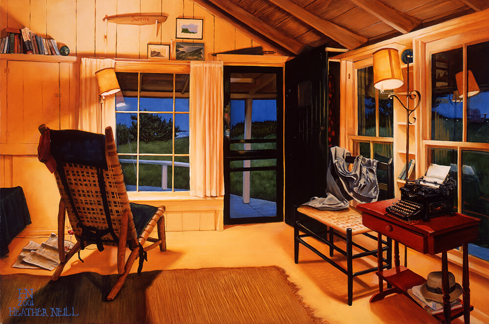 This house has been lifted off of the foundation and moved further inland twice in its life. The great Nor’easters which thunder up the coast reclaim portions of the mighty cliffs on the southeastern shore of Martha’s Vineyard every year. When I first started coming here to visit my friend Lynn we would park next to those pine trees which were then well behind the house. From this window one could see nothing but ocean as it caressed the jagged line of Lucy Vincent beach and out to the West Chop Lighthouse.