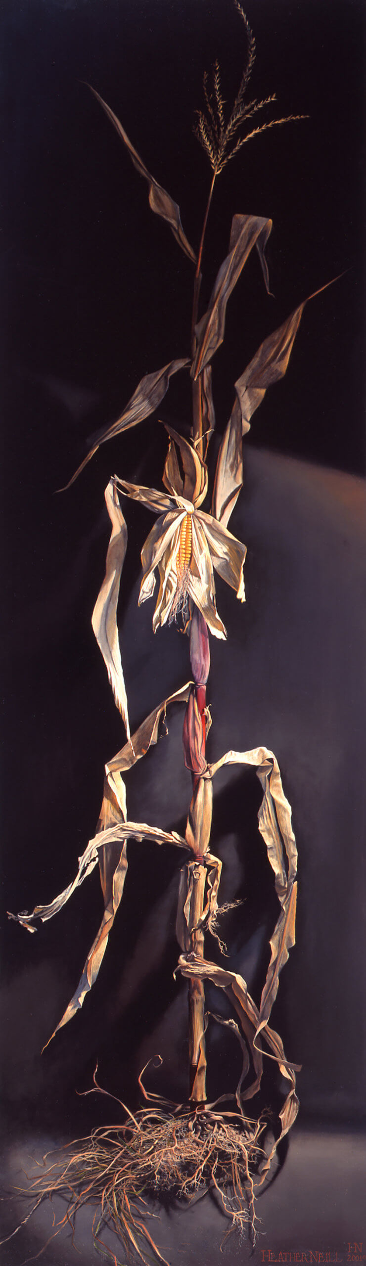 We have walked there a thousand times in search of the peace and solitude of the hidden haven of flora and fauna. Watching and waiting as the corn sprouted and grew in the summer sun, I wanted to better understand that crop which is so much a part of my Pennsylvania neighborhood and the most anticipated taste of the season. So, late on a September afternoon, I yanked the most interesting looking stalk out of the ground. Gully guarded it all the way home and resigned herself in a huff when it was carefully positioned and lighted in the studio and made clear to her that it was definitely not an overgrown fetching stick.