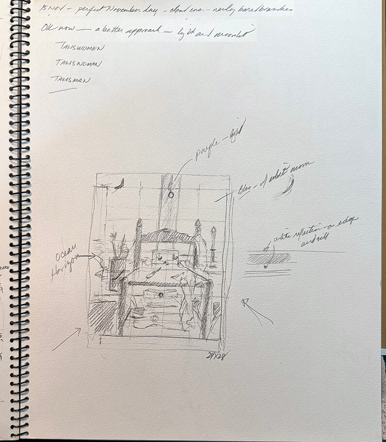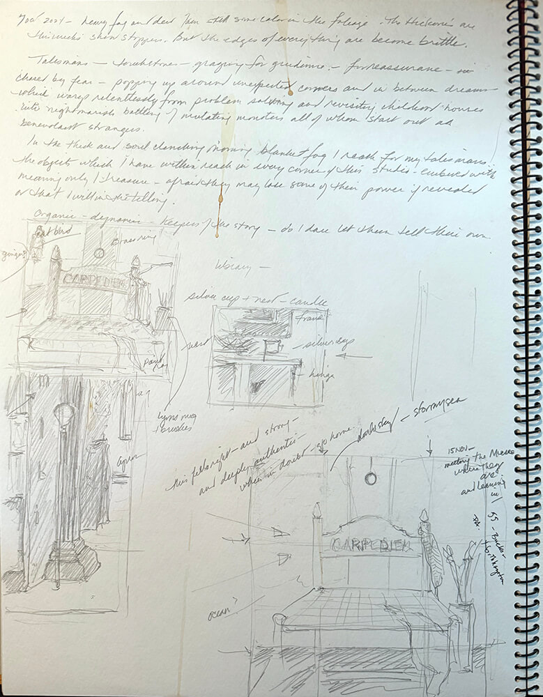 Unable to land on the best use of the “working title” of Talismen/women ? The objects surrounding and influencing the creative sphere are contributions from every corner and gender along the path. So, I referred back to these original sketchbook notations for some clarity and it would seem that the Muses had worked that out from the very start…Touchstones.