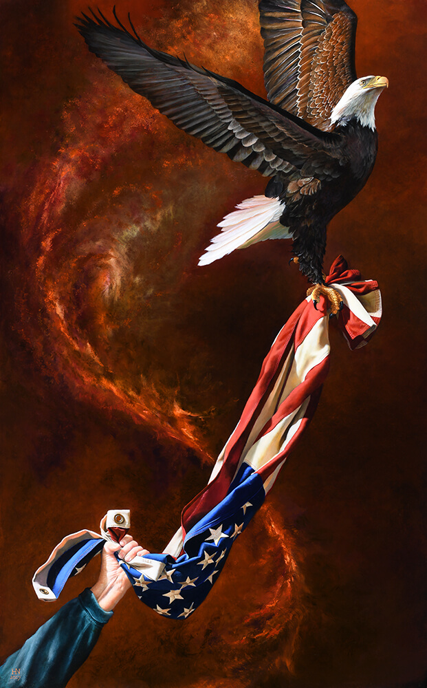 Flag – Dramatically wrenched into fierce tension – tightened, knotted, twisted, threadbare – shredding – coming unwoven – just a few stars