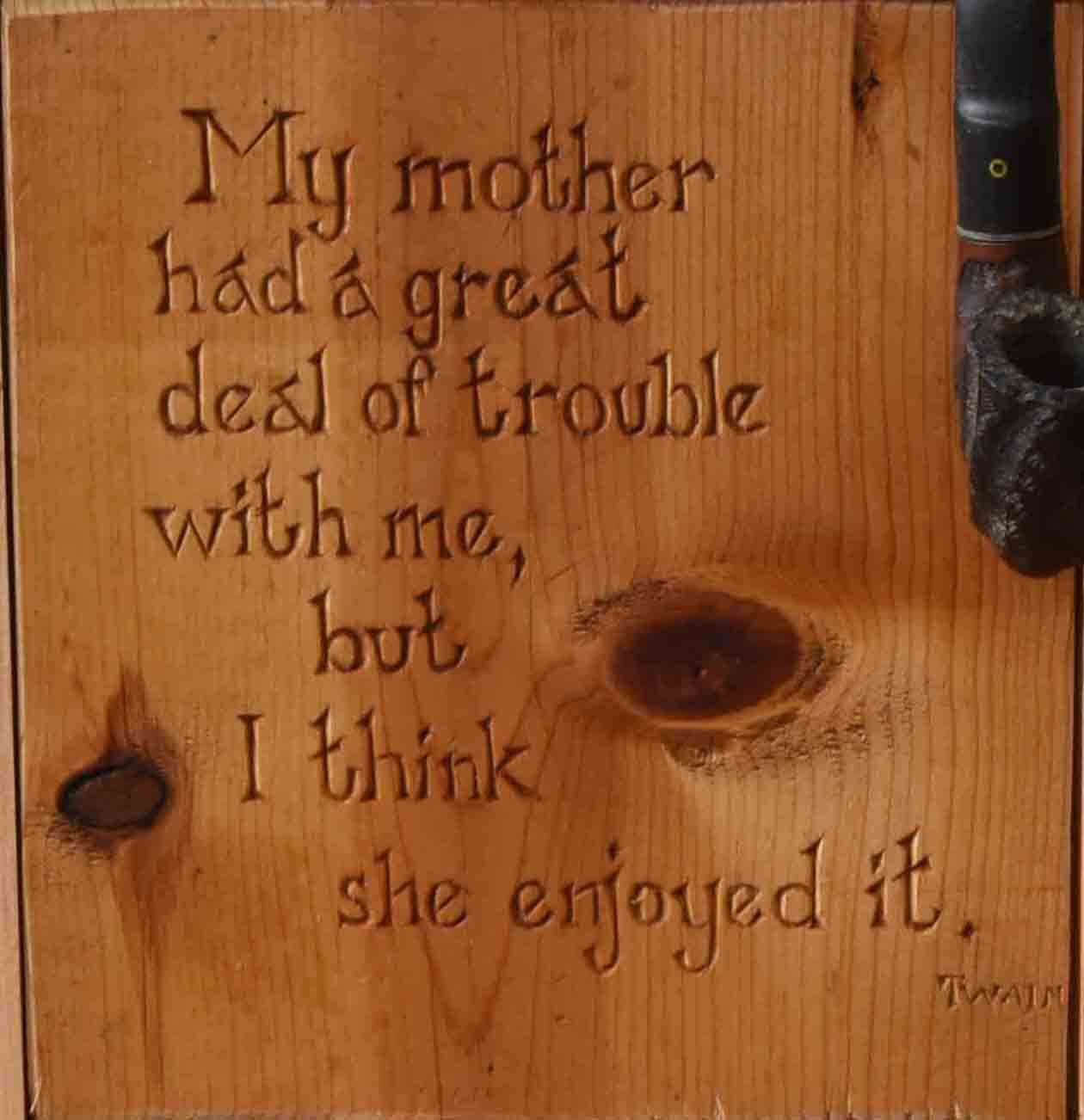 Long after I had made the move to fulfilling the dream of being a full time artist, our log cabin was caught in a massive flood. As we live 15 feet from the edge of a creek, it meant the entire basement was filled with water. Very little survived from that workshop but I took apart the tool chest and saved this door and carved a Mark Twain quote which was eminently applicable to Master Follansbee…