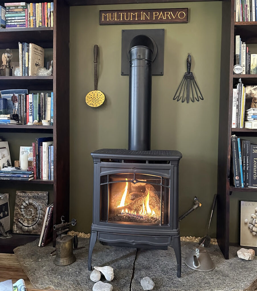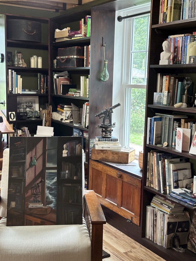 I’m going to address the mountain of paperwork just to the left of this keyboard now but out of the corner of my eye I can see the library below with the studio motto hanging in gold leaf above the hearth